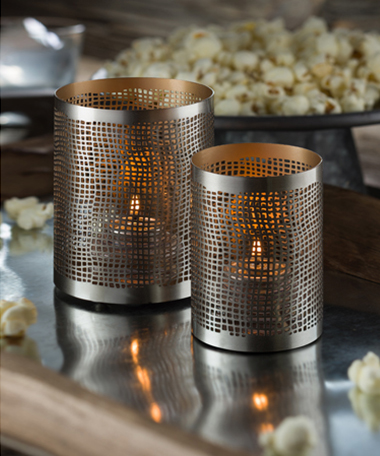 Candlelight reflects off the warm metallic interiors of copper and gold via the delicate organic lace screen pattern.