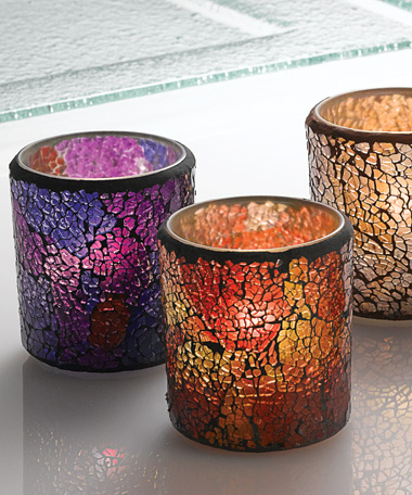 Colored, cracked glass features an exotic mosaic look for a fascinating show of light. Votives are also available with a frosted interior that exudes a calm soft light.
