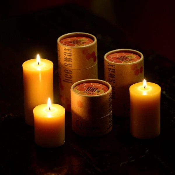 Q Candles, inc BeesWax Candles are made of 100% USA natural beeswax (not imported from China) with NO additives, no chemical scents and no artificial colors. Our 100% Handmade pure Beeswax candles are anti allergenic and are toxins free. These candles are burnning three times more than a paraffin wax candles (Paraffin wax is a petrolium bi product). They have a great natural honey like smell. These Beeswax Candles size 2″ diameter by 2″ tall, individually boxed, with a all cotton wick.